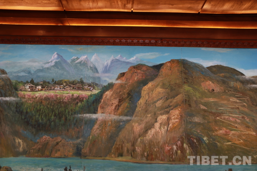 圖為色龍村內建筑上的壁畫,生動描繪了色龍村所處的特殊地理條件,右邊的盤山公路蜿蜒通過隧道之后而有左邊的“桃花源” 攝影:王妍丹