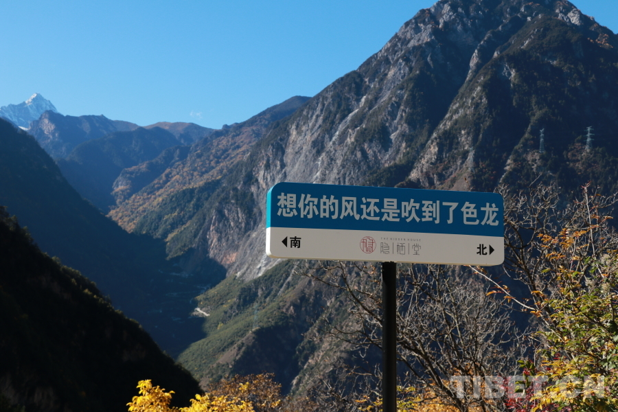 圖為色龍村民宿周邊的打卡牌,在雪山和秋葉的映襯下吸引著游客打卡拍照 攝影:王妍丹