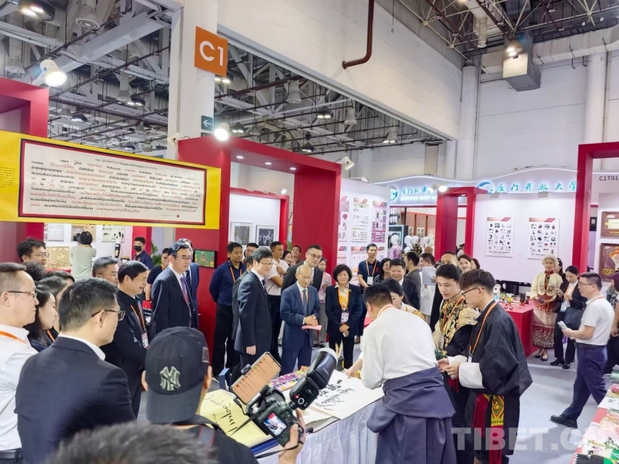 圖為西藏民族大學扎西曲吉參加第十六屆海峽兩岸(廈門)文化產業博覽交易會,現場書寫“團結統一”的漢藏雙語書法作品并做講解