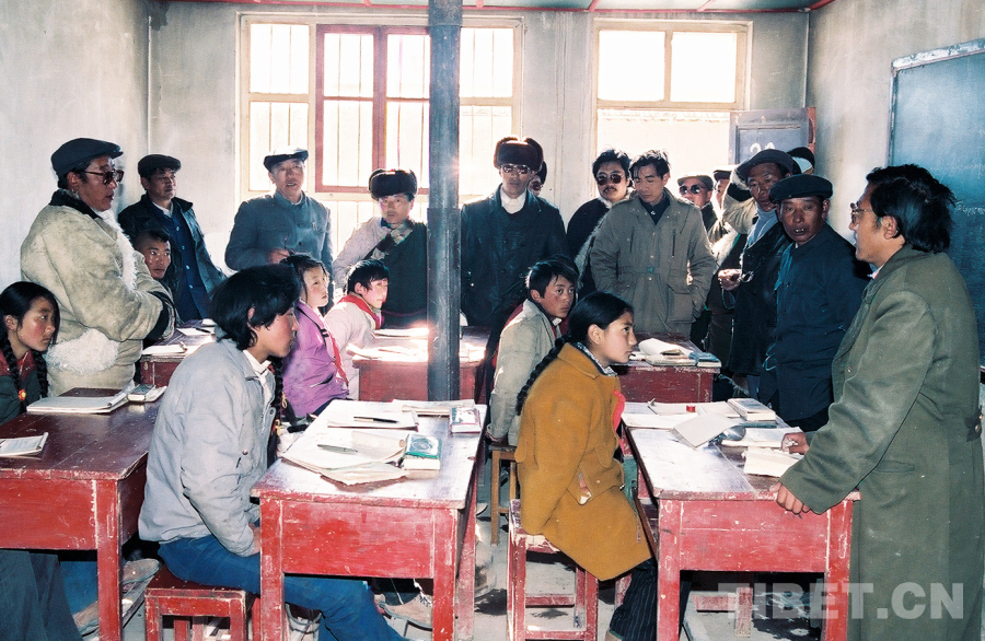 這是參加文部辦事處基層政權(quán)建設(shè)工作現(xiàn)場(chǎng)會(huì)“訪問團(tuán)”人員在參觀文部辦事處小學(xué)(唐召明1989年12月份攝)