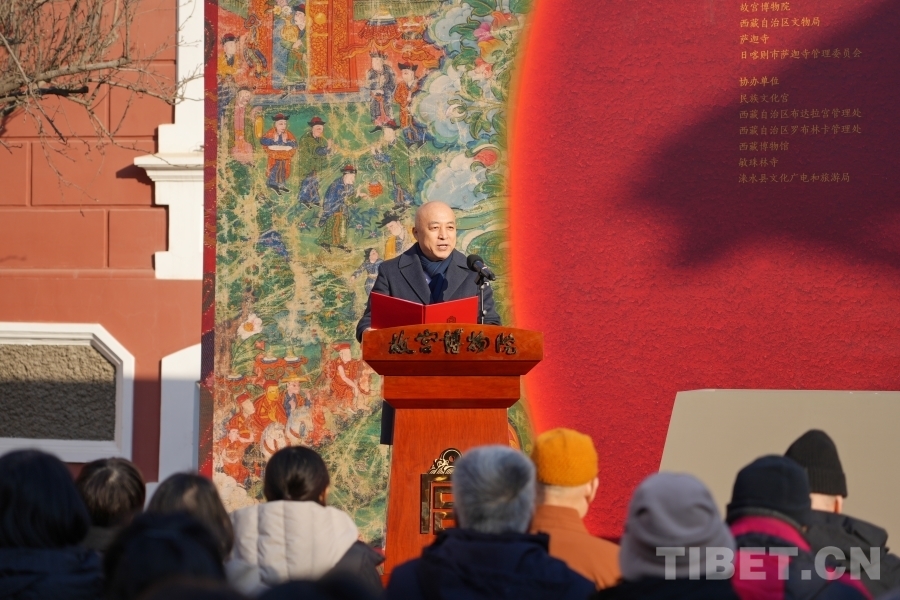 展覽開幕式現場,文化和旅游部黨組成員、故宮博物院院長王旭東,西藏自治區人民政府黨組成員、副主席徐志濤,故宮博物院原院長鄭欣淼,中國文物保護基金會理事長劉玉珠,中國佛教協會會長演覺,中國古跡遺址保護協會理事長宋新潮,國家民族事務委員會古籍整理研究室一級巡視員孫繼為,故宮博物院黨委書記、副院長都海江,文化和旅游部非物質文化遺產司二級巡視員張玲,西藏自治區人民政府辦公廳二級巡視員旦巴央培,西藏自治區文化廳黨組成員、西藏自治區文物局黨組書記、副局長趙興邦,全國政協委員、薩迦寺寺管會常務副主任洛卓加措,香港賽馬會慈善事務部主管葉巧兒出席。文化和旅游部、國家文物局下屬文博單位,西藏自治區人民政府下屬相關單位,北京市人民政府下屬相關單位,本次展覽的獨家捐助方公益慈善研究院,相關協會、學會、基金會,各參展單位,特邀相關業務合作單位等也現場出席。