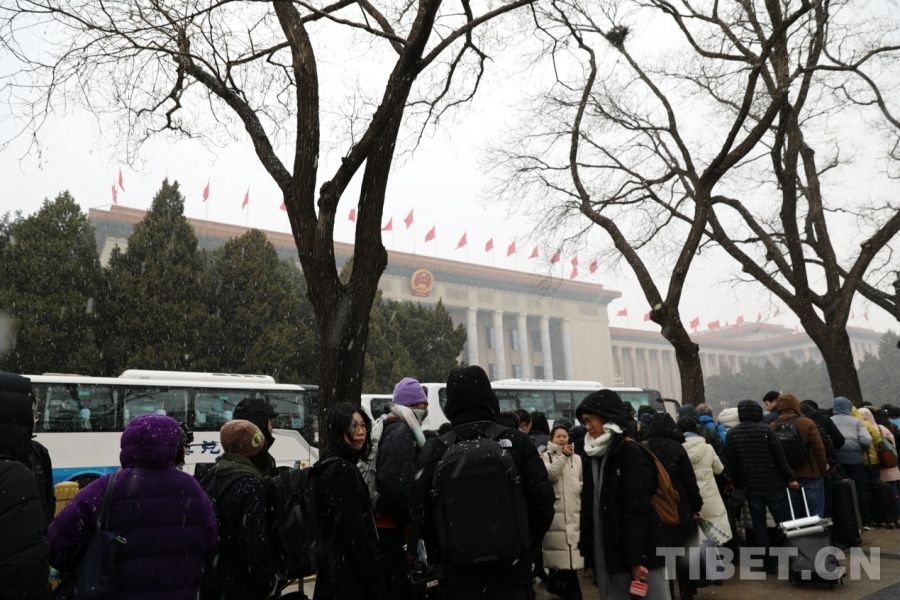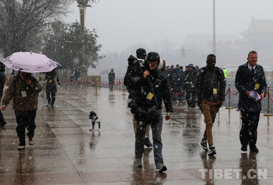 3月4日上午,十四屆全國人大四次會議舉行預備會議。會議結束后,一場春雪不期而至。在紛揚的大雪中,康巴衛視記者正在工作。攝影:劉莉