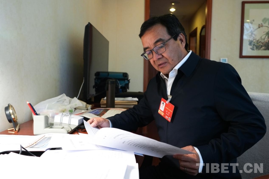 全國人大代表、西藏大學(xué)生態(tài)環(huán)境學(xué)院教授拉瓊在駐地看文件