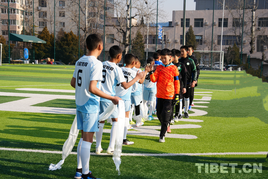 2025年12月29日,京藏少年開展足球聯誼賽,賽前擊掌,西藏青少年向對方球員獻哈達。攝影:宋俊