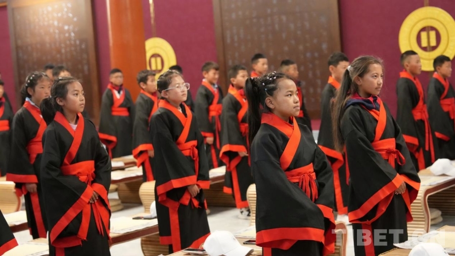 在曲阜書香研學基地,孩子們參加了開筆禮。為他們“朱砂啟智”的不是陌生的禮儀官,而是最熟悉的帶隊老師。錯那市中學教師索朗杰布穿上傳統服飾,拿起毛筆,蘸上朱砂,輕輕點在每一個學生的額頭。