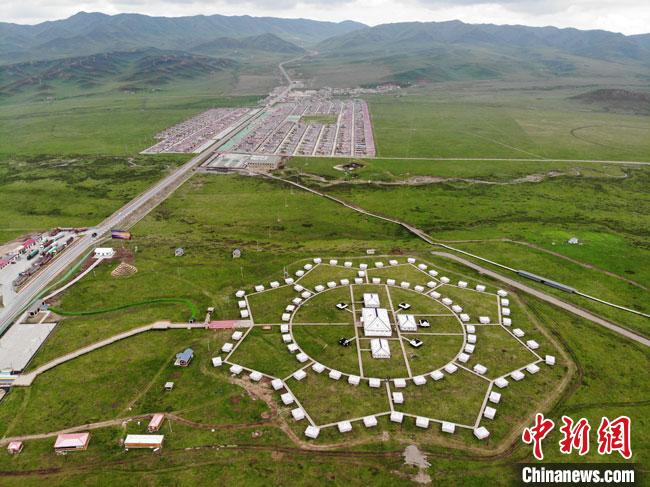 尕秀村的帳篷城由108頂大小各異的藏式風(fēng)格帳篷組成。空中俯瞰,一頂頂帳篷如同一顆顆璀璨的珍珠,點(diǎn)綴著曬銀灘草原的秀美。楊艷敏 攝