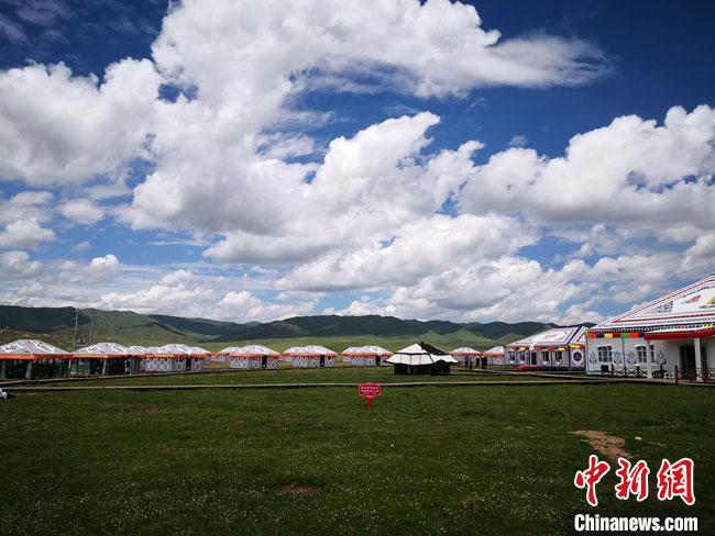 6月下旬,甘肅甘南藏族自治州碌曲縣尕海鎮(zhèn)境內(nèi)晴空萬(wàn)里,湛藍(lán)的天空如同水洗過(guò)般通透明亮,輕薄如棉的云朵隨風(fēng)移動(dòng)。被一碧萬(wàn)頃的草原簇?fù)碇逆匦愦澹瑵M目皆是古老藏飾風(fēng)格與現(xiàn)代時(shí)尚的交織融合,吸引絡(luò)繹不絕的游人前來(lái)體驗(yàn)“高原秘境”。