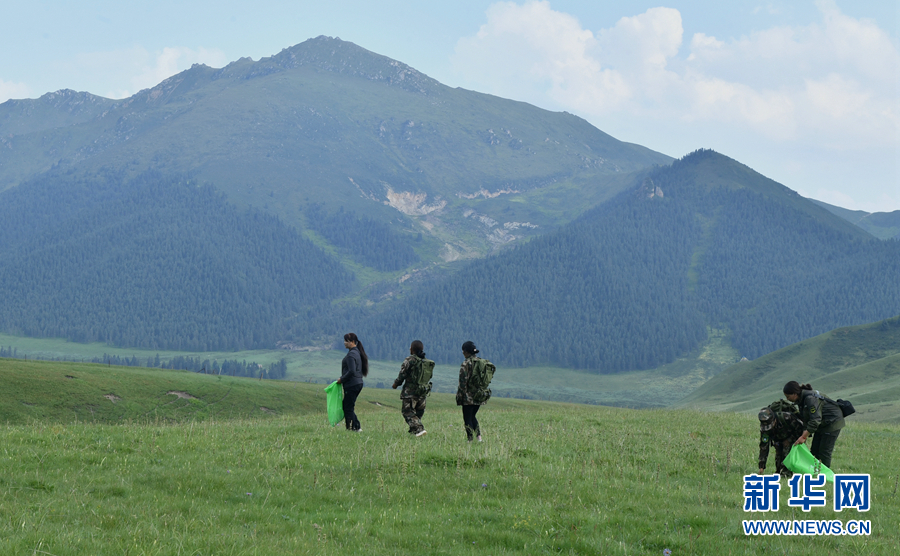 圖為祁連山國家公園青海片區青陽溝管護站生態管護員在草原上撿拾垃圾。新華網 卡婭梅朵 攝