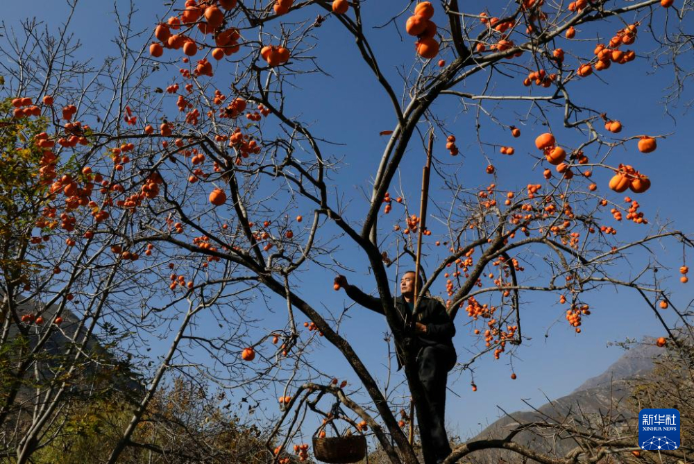 11月14日,在甘肅省甘南藏族自治州舟曲縣立節鎮杰迪村,村民在采摘柿子。新華社記者 方欣 攝