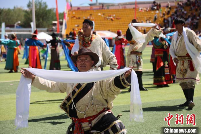 圖為民眾身穿民族服飾、手捧哈達。中新社記者 張添福 攝