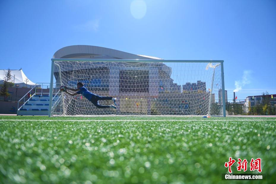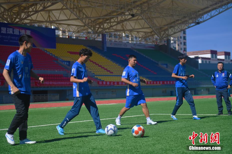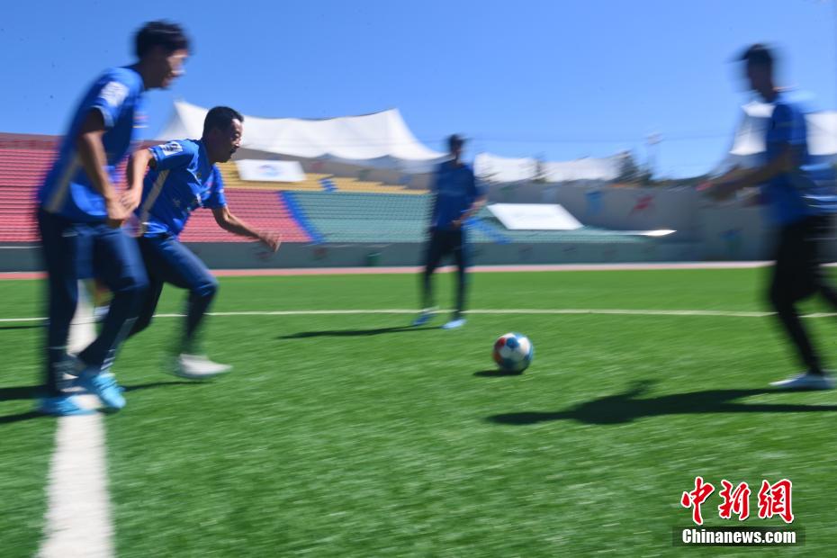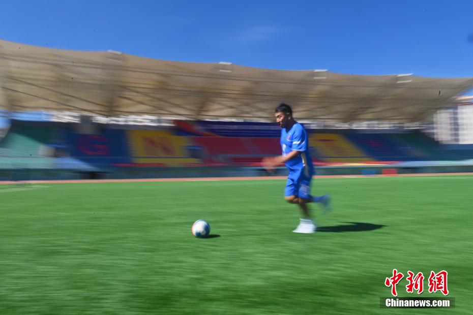 10月15日,在甘肅省甘南藏族自治州合作市一足球場內,甘南九二聯隊足球隊員進行訓練。