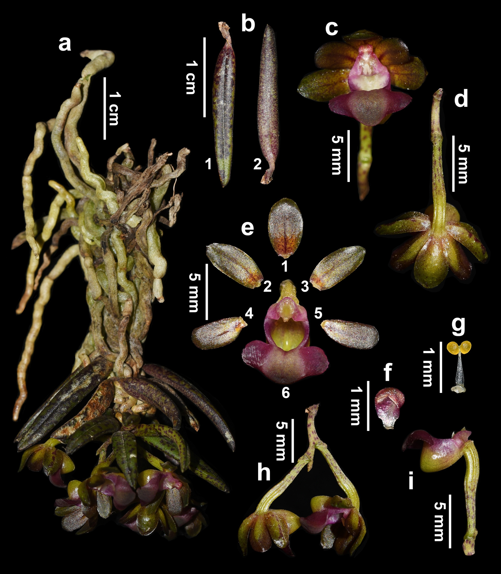 盆距蘭屬隸屬于蘭科樹(shù)蘭亞科指甲蘭亞族,全球約73種,是一類(lèi)附生在熱帶和亞熱帶山地森林中樹(shù)木或巖石上的草本植物。該屬植物的唇瓣色彩斑斕、結(jié)構(gòu)精巧,具有較高的觀賞價(jià)值。根據(jù)分析,九寨溝盆距蘭隸屬于盆距蘭屬列葉組,該種的發(fā)現(xiàn)將列葉組的物種數(shù)量增加到16種,不僅豐富了物種圖譜,更對(duì)區(qū)域植物生態(tài)適應(yīng)機(jī)制研究具有重要價(jià)值。(圖片由中國(guó)科學(xué)院成都生物研究所提供)