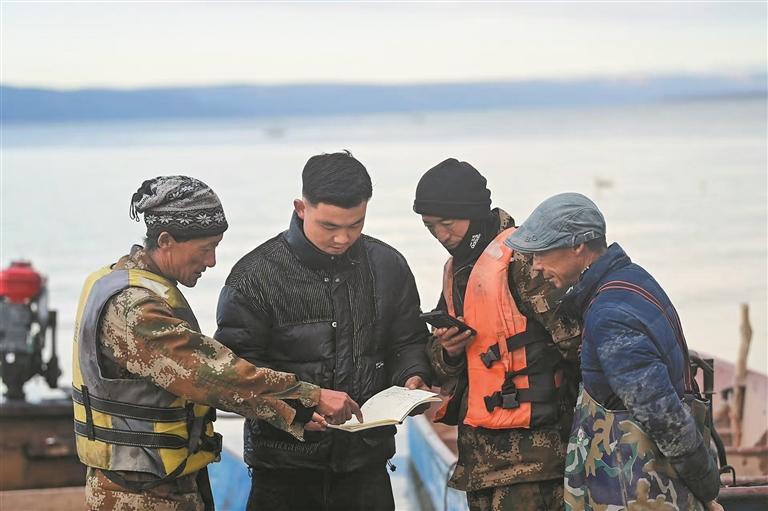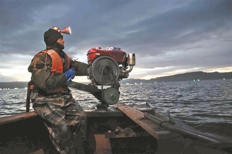 夜幕降臨,亮起一盞盞漁燈,鋪滿湖面,仿佛星星“掉進”龍羊湖,組成了湖面萬里星河,成為鄉村旅游發展“打卡地”。沈海明駕駛漁船駛入布網區,隨著絞盤作響,漁網出水,無數銀鱗在燈光中跳躍,一網網的收獲變成了漁民們實實在在的收入。漁民們的幸福生活在“下網”與“收網”的漁歌唱晚間邁向更好的明天。