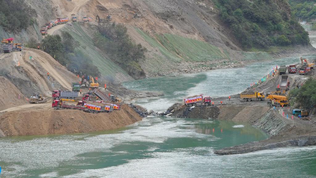 10月28日,自卸卡車協(xié)同作業(yè)將成噸石料拋投進牙根一級水電站主龍口位置。(雅礱江流域水電開發(fā)有限公司供圖)