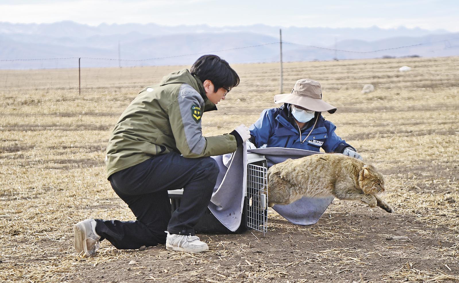 2月11日,祁連山國家公園野生動物救護繁育站在海北藏族自治州門源回族自治縣老虎溝成功放歸一只成年雄性荒漠貓。
