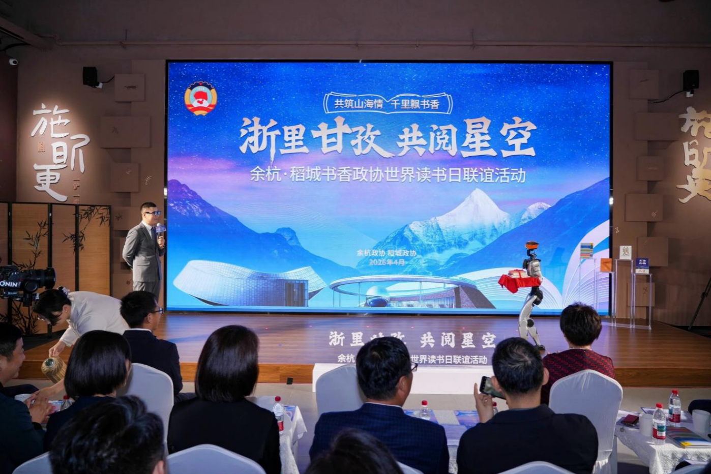 活動中,兩地主持人佩戴著余杭區本土企業研發的智能眼鏡,宇小睿G1+機器人則化身“書香使者”,將承載江南文脈的書籍送上舞臺。余杭向稻城贈送《五千年良渚王國》等書籍,稻城回贈《色韻稻城》等特色讀物,一本本書籍,成為兩地情誼的生動載體。