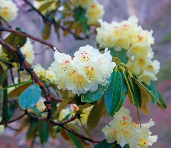 如此豐富的色彩或許與勒布溝景區內杜鵑花的品種有很大的關系。據悉,勒布溝內共分布著大葉杜鵑、小葉杜鵑和高山杜鵑三大品種。“大葉杜鵑花,其實叫杜鵑‘樹’更為貼切,不管是枝干、花葉還是花朵,都比另外兩種杜鵑花要大,花葉比手掌大,而花朵更是如碗口大小。大葉杜鵑主要分布在麻瑪鄉‘野狼谷’附近。”阿邊說。