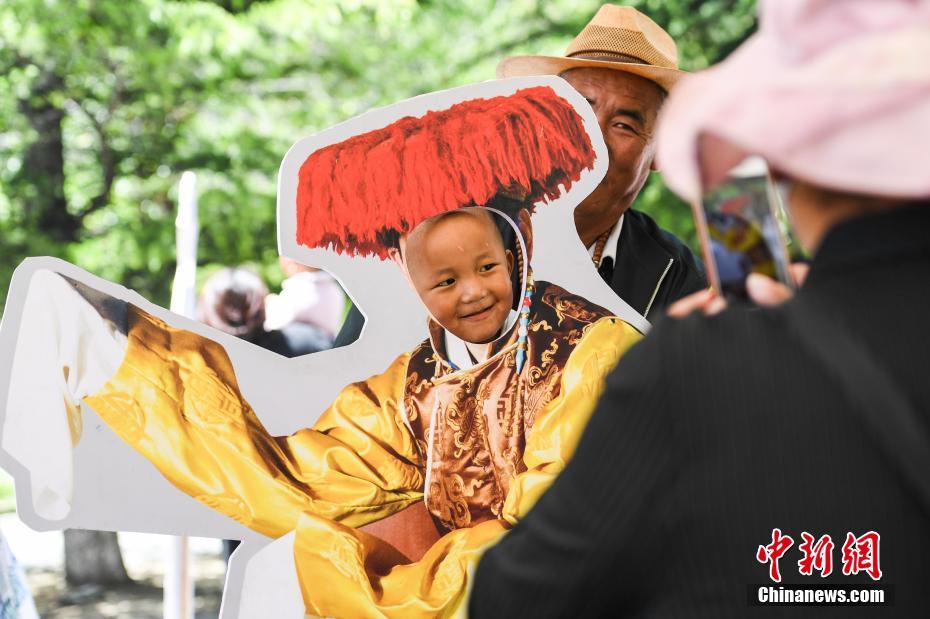 5月25日,2019年“藏戲演出季”第二場演出在西藏拉薩布達拉宮腳下的宗角祿康公園開演。據了解,2019年藏戲演出季將持續到今年的7月20日,每周六來自拉薩八縣區的優秀藏戲隊將相繼進行公益表演。圖為當地兒童體驗藏戲人物裝扮造型。中新社記者 何蓬磊 攝