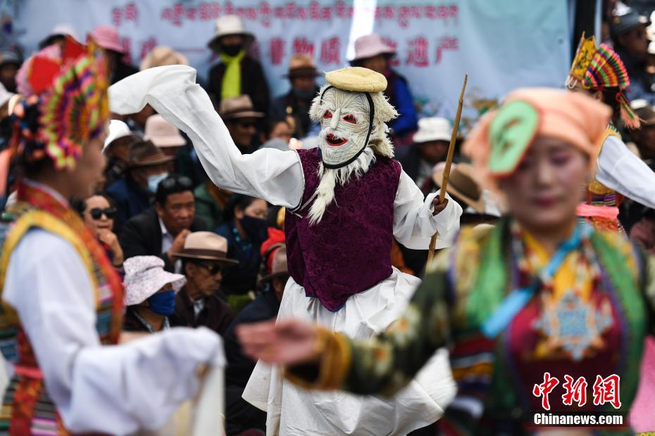 5月25日,2019年“藏戲演出季”第二場演出在西藏拉薩布達拉宮腳下的宗角祿康公園開演。據了解,2019年藏戲演出季將持續到今年的7月20日,每周六來自拉薩八縣區的優秀藏戲隊將相繼進行公益表演。圖為藏戲藝人正在進行表演。中新社記者 何蓬磊 攝