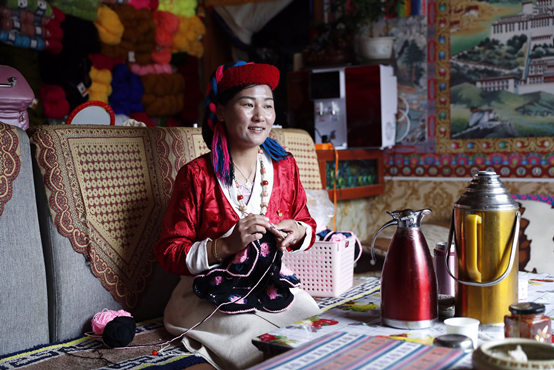 照應客人的閑暇,卓瑪做一些毛線手工編織。新華網 焦鵬 攝