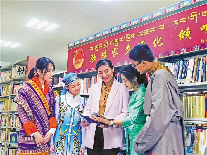 圖為共青團(tuán)西藏自治區(qū)委員會副書記格桑卓瑪(左三)向武漢西藏中學(xué)的學(xué)生們介紹“觸摸家鄉(xiāng)變化·傾聽黨的聲音”主題書刊。央金 攝