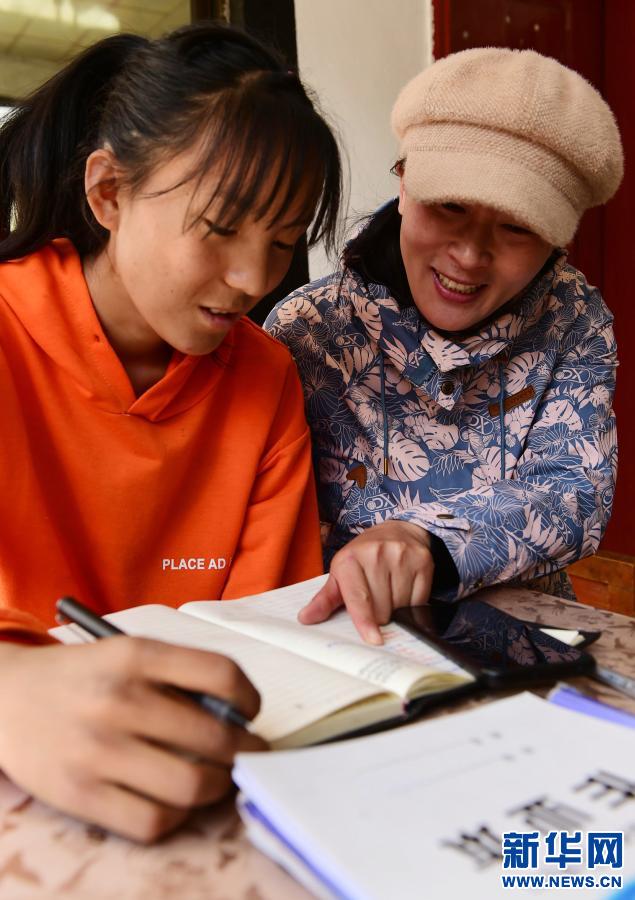 2020年3月26日,在西藏林芝市朗縣扎西塘村的一戶建檔立卡貧困戶家中,西藏林芝市委宣傳部駐村工作隊員何曉雪(右)正在為學生輔導功課。 新華社發(索朗羅布 攝)