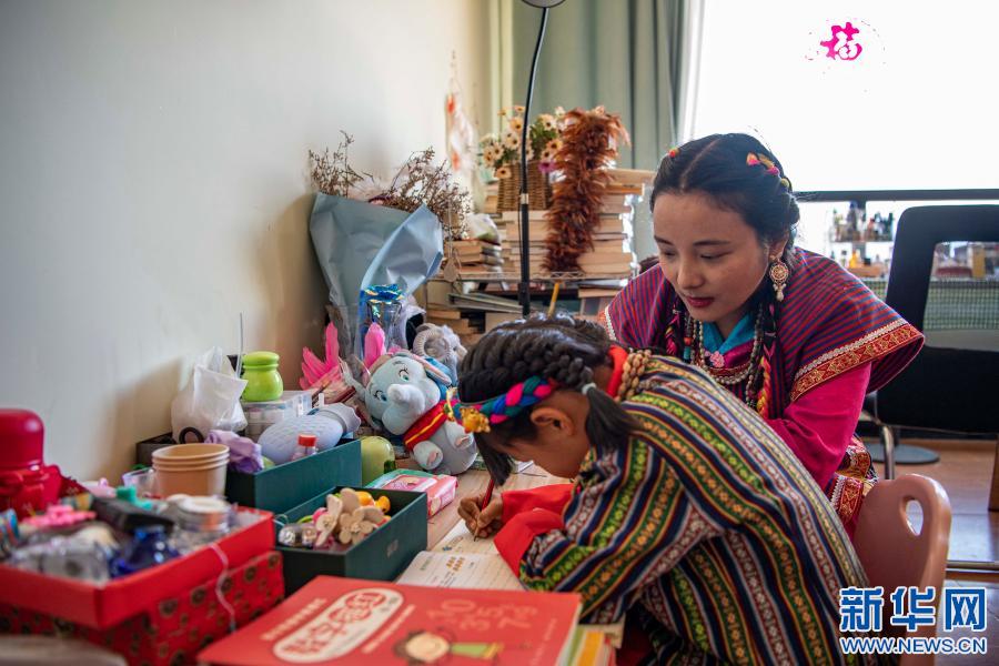 在位于西藏林芝市墨脫縣的家中,扎西玉珍指導女兒寫作業(2月11日攝)。新華社記者 孫非 攝