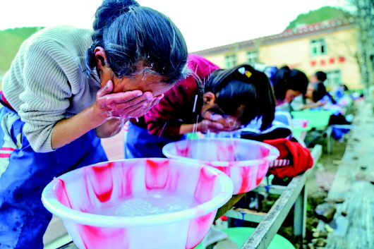 4月30日,在類烏齊縣桑多鎮第二小學,學生們用熱水洗漱。這套熱水設施由李純民發起的“齊興”助學獎勵基金捐助。 記者劉金海、黃臻攝