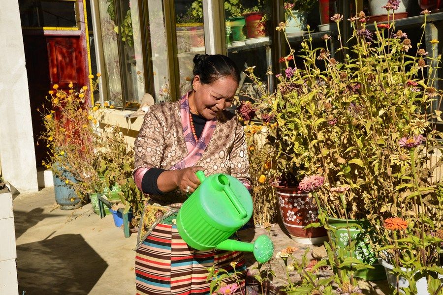 阿里地區札達縣札布讓村村民金珠德吉在院子里澆花。新華社記者 田金文 攝