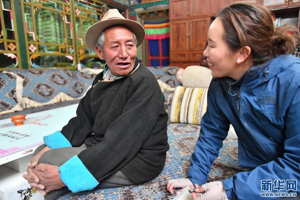 5月10日,多布杰老人(左)在江孜縣班久倫布村的家里和來訪的鄉干部聊天。新華社記者 孫瑞博 攝