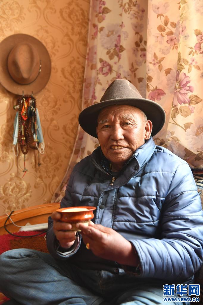 在西藏拉薩堆龍德慶區特困人員集中供養中心,一位老人在品嘗使用低氟“健康茶”制作的酥油茶(4月27日攝)。新華社記者 孫瑞博 攝
