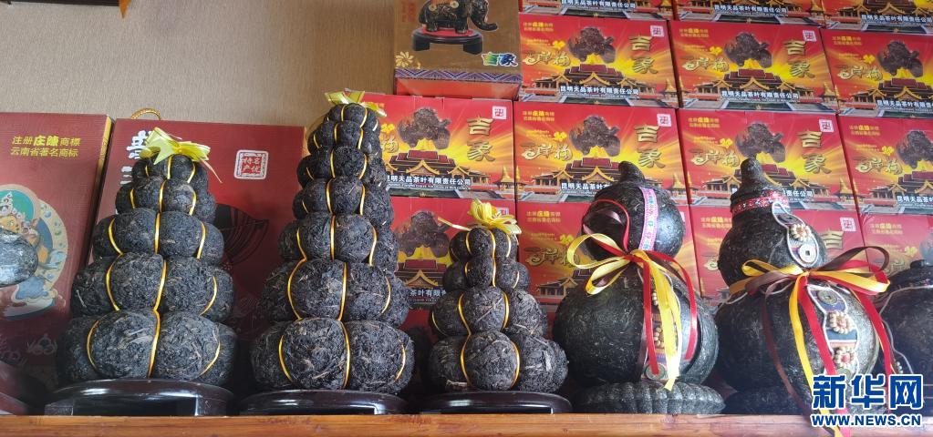 在位于西藏拉薩的一家茶葉公司的門店內擺放著造型獨特的茶葉制品(4月23日攝)。新華社記者 張京品 攝