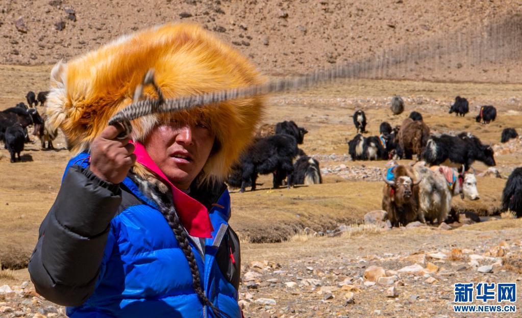 在西藏日喀則市定日縣扎西宗鄉藏普村的牧場里,牧民扎西正在趕牦牛(2020年4月23日攝)。新華社記者 孫非 攝