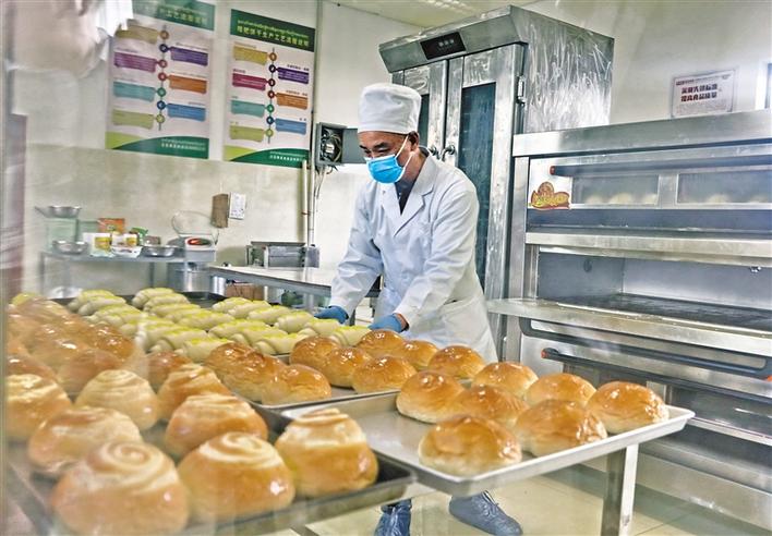 昌都市芒康縣峨江優質青稞種植基地農牧民合作社工人在車間生產線上擺放青稞產品。丹增群培 唐斌 攝