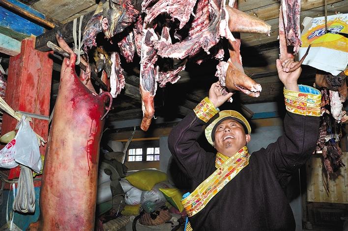 林芝市米林縣羌納鄉結果村村民旺杰在查看風干肉晾制情況。王雅慧 攝