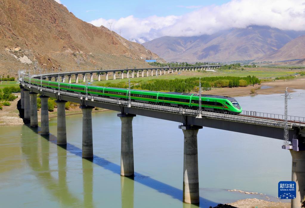 試運(yùn)行的復(fù)興號列車行駛在桑日縣境內(nèi)(6月8日攝)。新華社記者 普布扎西 攝