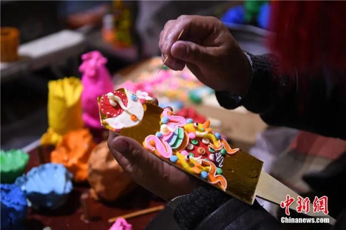 2022年2月14日,酥油花手工藝人在拉薩八廓古城現(xiàn)場制作。藏歷新年臨近,酥油花在年貨市場熱銷。酥油花在藏語中稱為“孜扎”,是古時藏傳佛教信眾因冬季沒有鮮花供佛而發(fā)明的替代品,如今已是藏族老百姓家庭中必備的年貨之一。中新社記者 貢嘎來松 攝