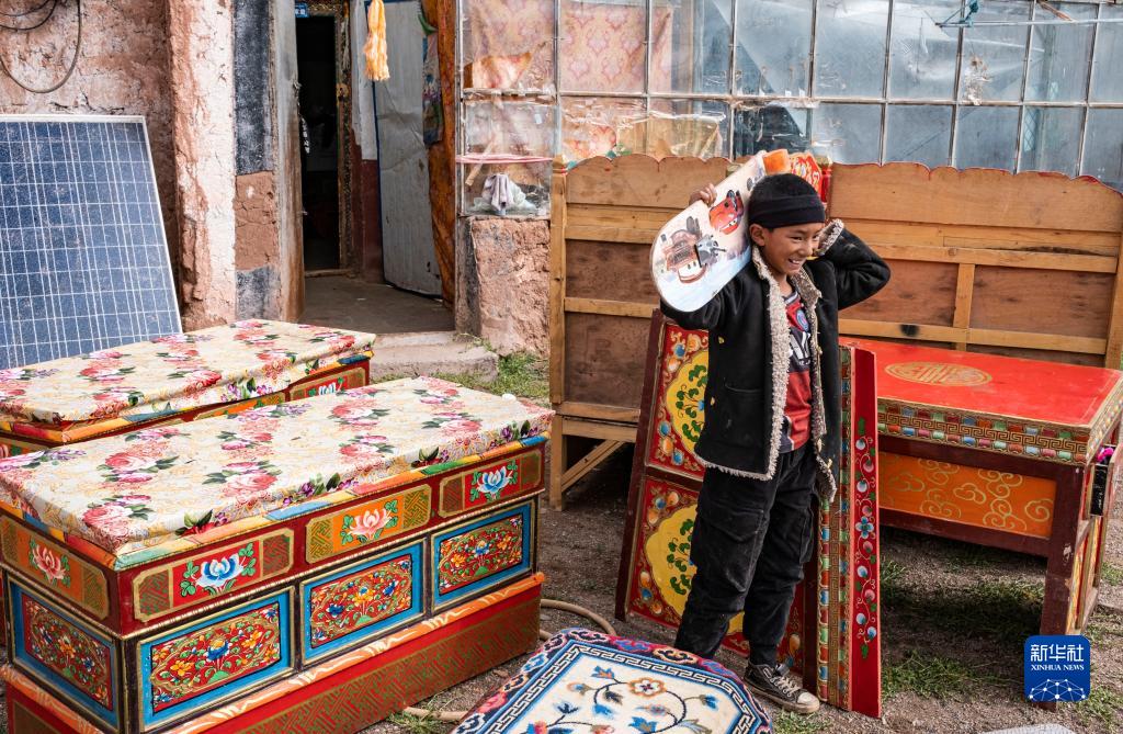 雙湖縣多瑪鄉仲魯瑪村的孩子拿著自己心愛的滑板。雖然滑板的輪子已經掉了,他還是想帶到新家去(7月13日攝)。新華社記者 孫非 攝