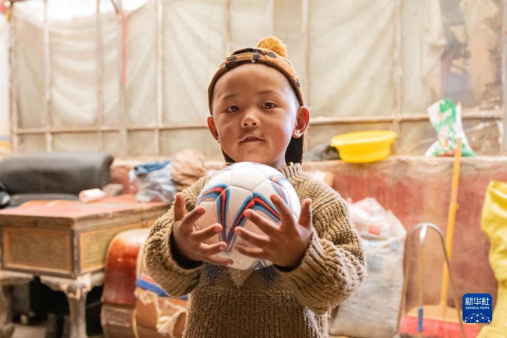 在雙湖縣多瑪鄉果根擦曲村,三歲的洛桑赤勒手里抱著足球(7月12日攝)。新華社記者 周荻瀟 攝
