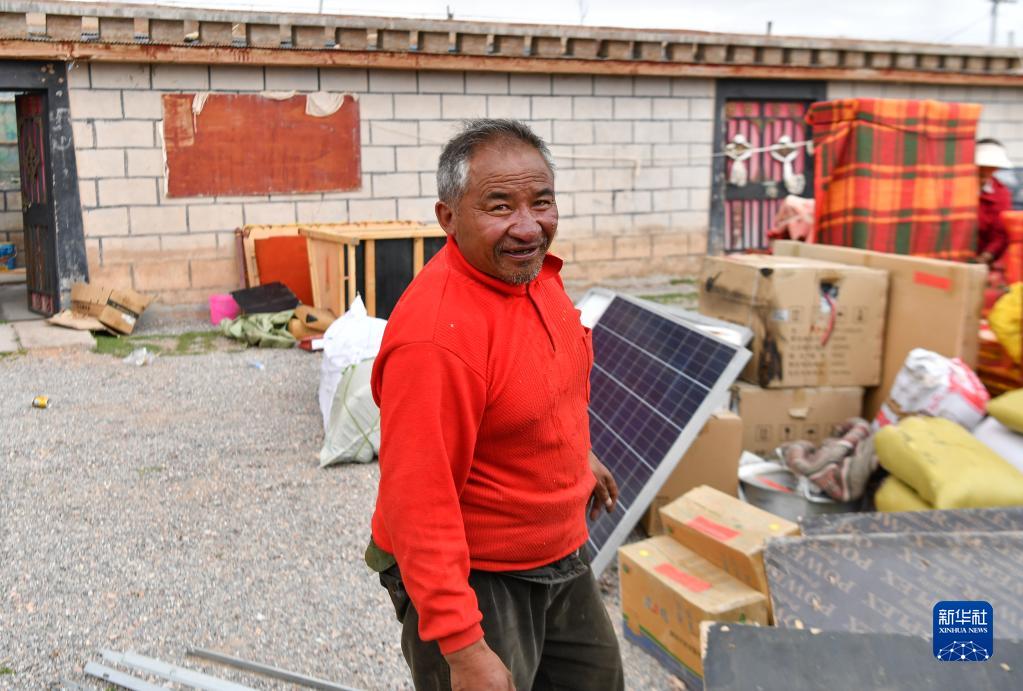 雙湖縣多瑪鄉仲魯瑪村牧民索朗措加在整理即將搬運到森布日安置點的家具(7月12日攝)。新華社記者 晉美多吉 攝
