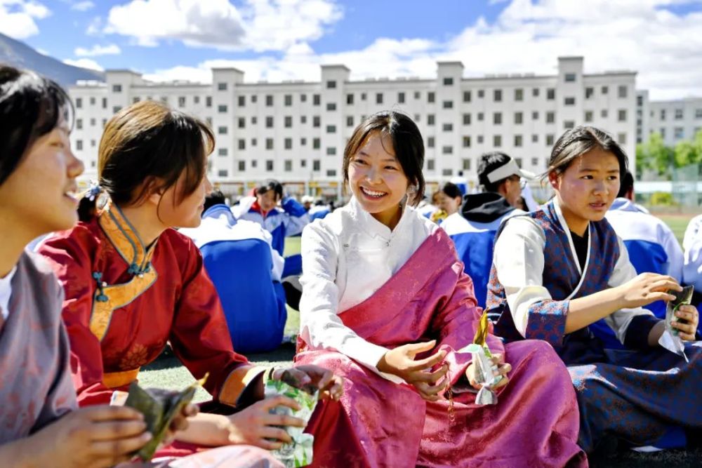 西藏山南市第二高級(jí)中學(xué)的學(xué)生品嘗安徽省援藏干部和企業(yè)家代表贈(zèng)送的粽子(2022年6月3日攝) 張汝鋒 攝