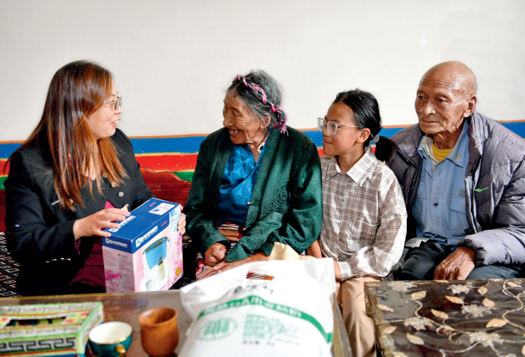 王玉秀(左一)來(lái)到拉薩市達(dá)孜區(qū)德慶鎮(zhèn)次旦老人家走訪并送上慰問(wèn)品(2022 年 7 月 27 日攝) 張汝鋒攝