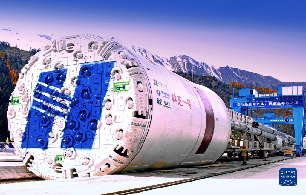 派墨公路多雄拉隧道施工采用的“林芝一號”全斷面雙護盾硬巖掘進機(TBM)完成組裝并順利進行首次滑行(2015年10月29日攝)。新華社發(董志雄 攝)