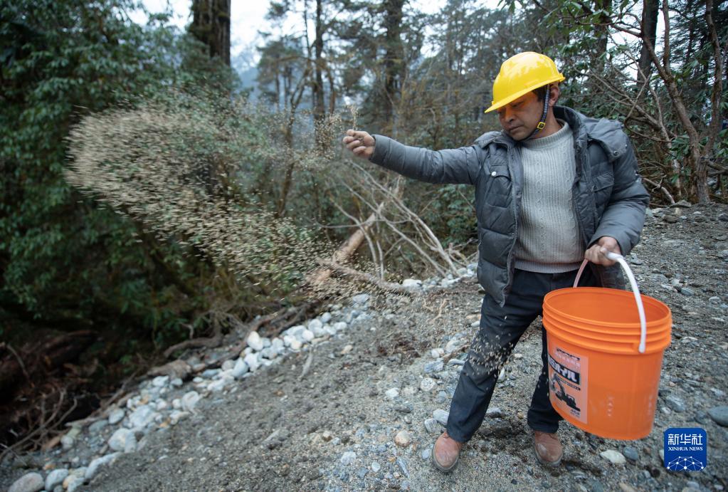 工人在派墨公路沿線撒播植物種子(2021年3月11日攝)。新華社發(董志雄 攝)