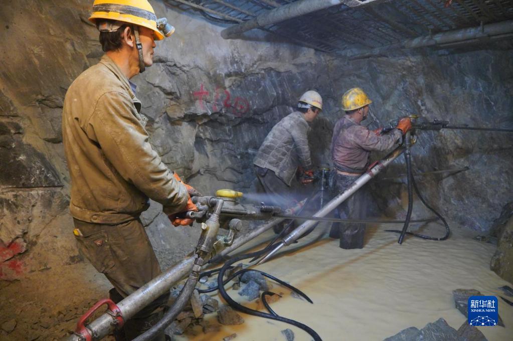 工人在派墨公路老虎嘴隧道掌子面打鉆作業(2021年2月9日攝)。新華社發(董志雄 攝)