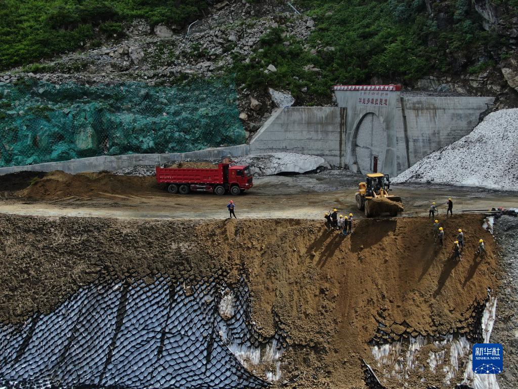 工人在派墨公路多雄拉隧道出口段土工格室高寒邊坡綠化實驗項目現場施工(2020年8月18日攝,無人機照片)。新華社發(董志雄 攝)