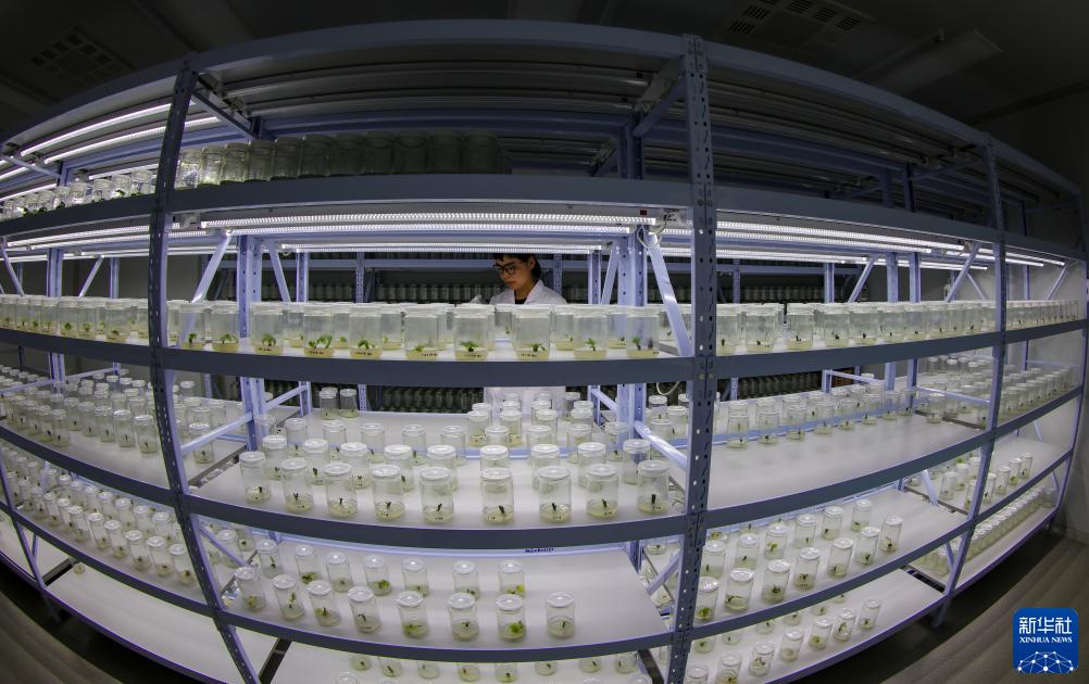 劉利平博士在高原核桃研究所檢查核桃組織培養標本(7月27日攝)。新華社記者 姜帆 攝