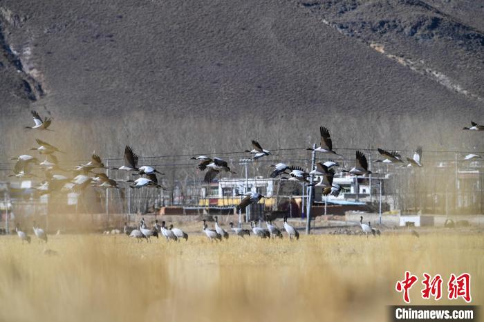 圖為拉薩市林周縣田間飛翔的黑頸鶴。貢嘎來松 攝
