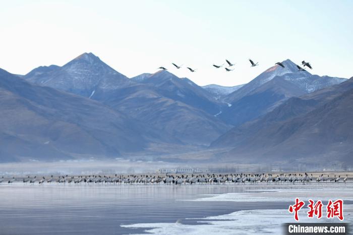 圖為拉薩市林周縣虎頭山水庫越冬的黑頸鶴。貢嘎來松 攝