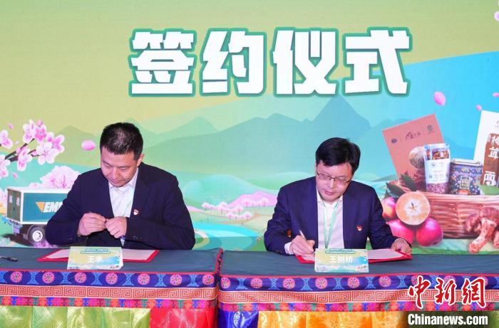 圖為中國郵政集團有限公司西藏自治區分公司黨委書記、總經理王樹橋(圖右)與西藏供銷集團董事長王豐簽約。中國郵政集團有限公司林芝市分公司供圖。